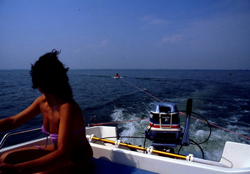 Il piccolo porticciolo era (credo sia ancora) quanto di più bello e comodo avessi mai potuto immaginare, la barca era esattamente a 15 mt dalla mia roulotte, il lago era sempre calmissimo, insomma era il paradiso......per un principiante , non poteva esistere un posto migliore al mondo, tant'è che decido sia giunto il momento di imparare a fare lo sci nautico e guarda caso il camping disponeva di una imbarcazione attrezzata di tutto punto proprio per questo scopo, l'insegnante era Simona, la maggiore delle tre figlie e grazie alla sua pazienza, sia io che la mia ragazza abbiamo imparato (in una decina di lezioni) a sciare sull'acqua, e la voglia di farlo con la mia barca era enorme, ma mi mancava tutta l'attrezzatura e poi chissà se ce l'avesse fatta a tirare uno sciatore fuori dall'acqua.....
