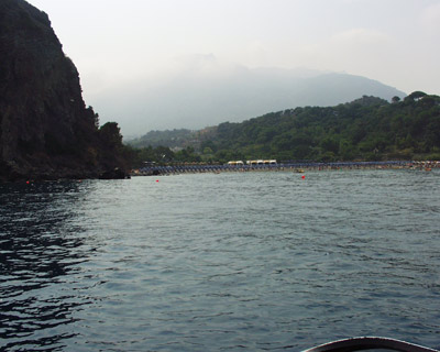 ma anche questa era visibile solamente da un miglio di distanza, nonostante la sua enorme altezza..... quindi anche le foto ne hanno risentito.... appena arrivati abbiamo fatto un bagno in un mare "finalmente blu e trasparente".... non sapendo che sarebbe stato l'ultimo..... in queste condizioni.... rinfrescati ci mettiamo alla ricerca di un posto in porto qualsiasi del Golfo di Napoli e riusciamo a trovarlo a Castellamare di Stabia (40,00 €).... quindi rimettiamo in navigazione le ns. barche e (sempre nella nebbia) ci trasferiamo passando a traverso di Procida....
